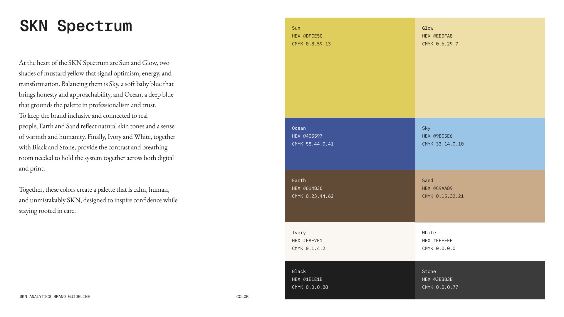 The SKN Spectrum, a palette of mustard yellows, soft blues, deep ocean tones, and earth-toned skin references, replaced the monochrome with something warmer, more human, and unmistakably intentional. Sun and Glow signal optimism and transformation. Sky and Ocean carry honesty and trust. Earth and Sand anchor the whole system in real skin, real people, real results.